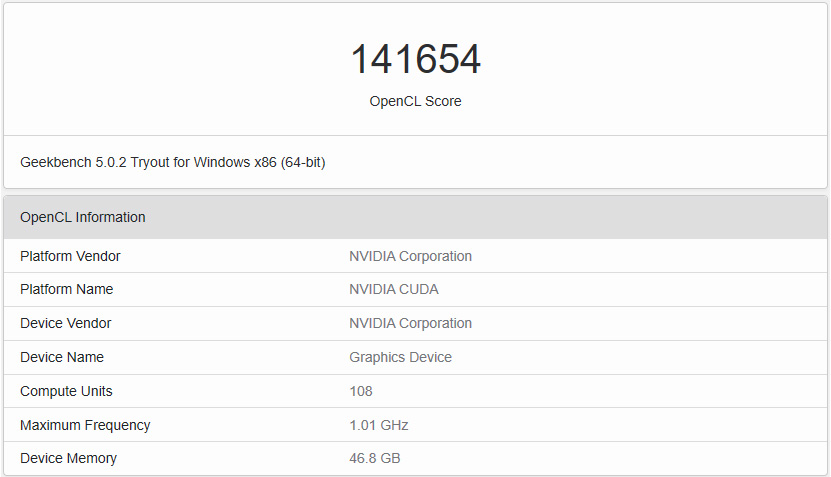 Heikomman mutta edelleen kovan 141 654 pisteen tuloksen saanut näytönohjain on varustettu puolestaan 1,01 GHz:n kellotaajuudella toimivalla 108 SM-yksikön (6912 CUDA-ydintä mikäli suhdeluvut pysyvät ennallaan) grafiikkapiirillä. Muistia näytönohjaimessa on kuitenkin peräti 47 Gt, tai todennäköisemmin 48 Gt, josta näkyy syystä tai toisesta hieman vähemmän Geekbenchille.