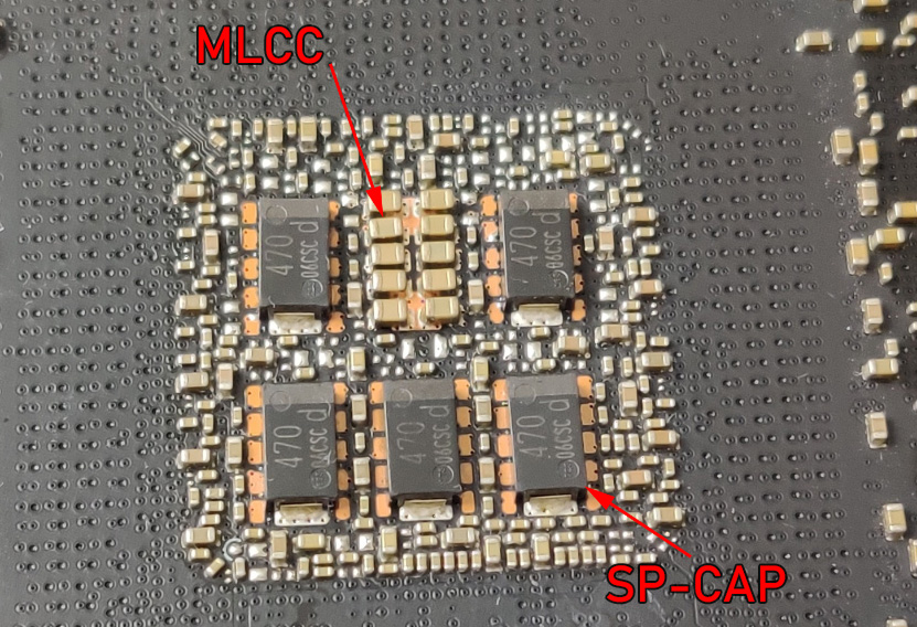 Saksalainen ylikellottaja ja tekniikkatubettaja Der8auer on perehtynyt aiheeseen käytännön tasolla testaamalla Gigabyten GeForce RTX 3090 Gaming OC -näytönohjainta alkuperäisellä kuudella 470 μF SP-CAPS-kondensaattorilla, poistamalla niistä kaksi käytöstä ja lopuksi korvaamalla kaksi SP-CAPS-kondensaattoria MLCC-kondensaattoreilla. Alkuperäisellä kuuden SP-CAPS-kondensaattorin konfiguraatiolla grafiikkapiiri toimi Time Spy 4k -testissä vakaasti noin +70 MHz:n korotetulla kellotaajuudella. Kun kaksi SP-CAPS-kondensaattorit irroitettiin, testi kaatui lähes välittömästi kyseisellä kellotaajuudella. Kun kaksi SP-CAPS-kondesaattoria korvattiin MLCC-kondensaattoreilla, saatiin grafiikkapiirin kellotaajuutta korotettua +100 MHz eli 30 MHz enemmän. Todelliset kellotaajuudet pyörivät 1900 MHz:n tuntumassa ja näytönohjaimen menohaluja näytti rajoittavan Power Limit -tehorajoitus.