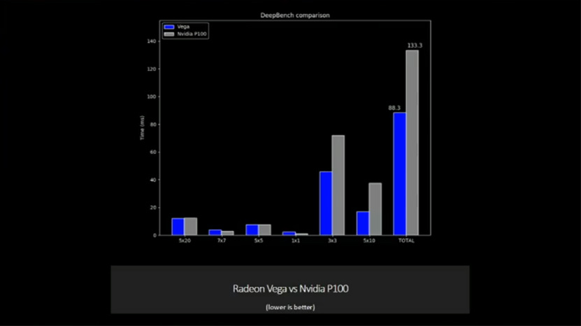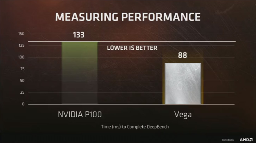 Vegan käytännön suorituskykyä esiteltiin DeepBench-testiohjelmalla. DeepBench mittaa laskentakorttien ja näytönohjainten suorituskykyä syvien neuroverkkojen saralla. AMD:n tapahtumassa livenä ajamien testien mukaan Vega suoriutuu testistä 88 millisekunnissa, kun NVIDIAn P100:lla aikaa kului 133 millisekuntia. Testin eri osissa Vega ja P100 olivat pääosin tasaväkisiä, mutta Vega repi eroa edukseen 3×3- ja 5×10-testeissä.